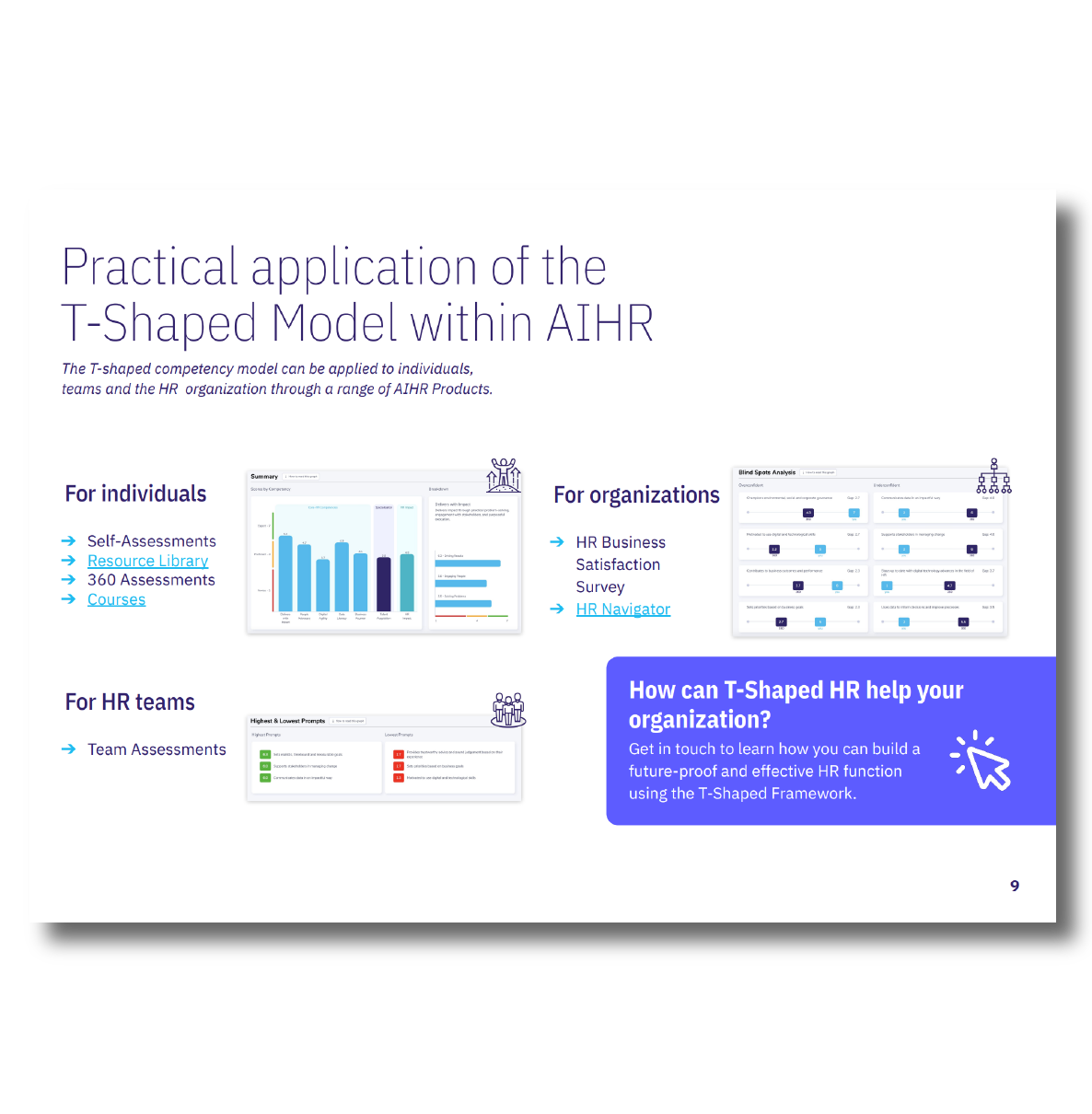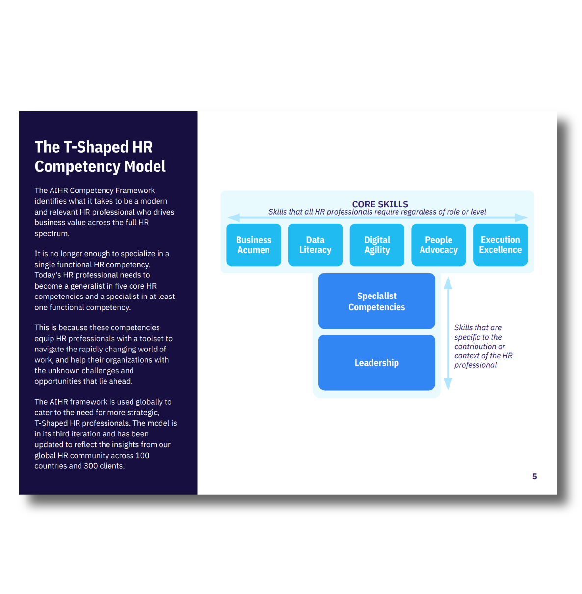 It is no longer enough to specialize in a single functional HR competency. HR Professionals need to become a generalist in five core HR competencies and a specialist in at least one functional competency. In the T-Shaped HR framework, each competency is broken down into components that will help you better understand the competency levels in your HR organization.