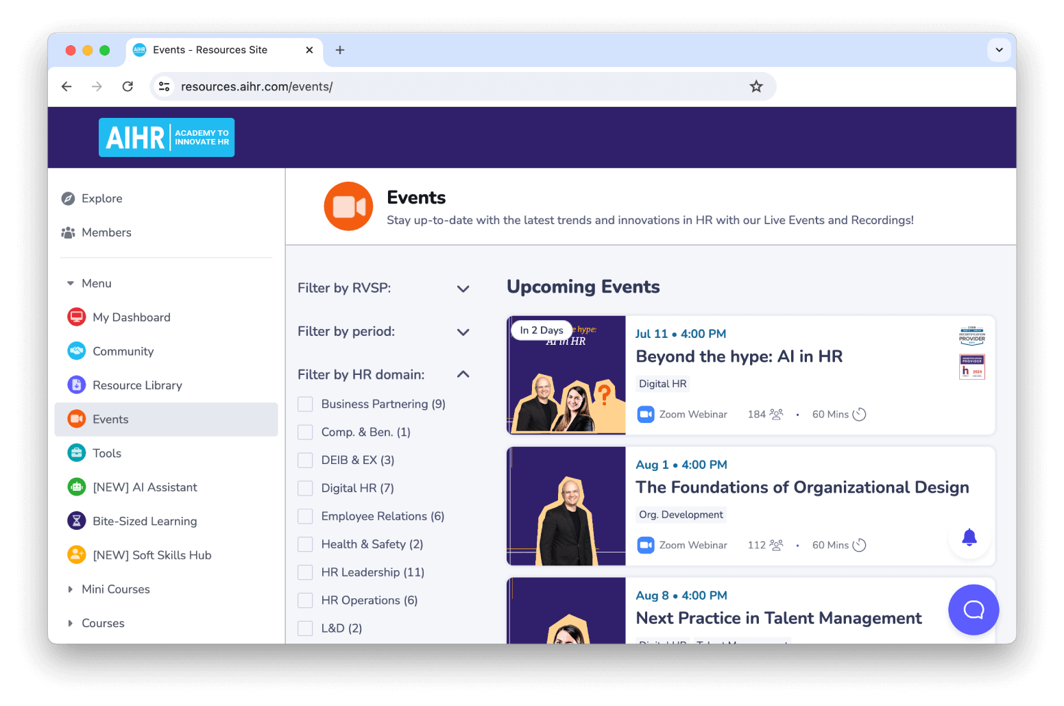 You get access to a wide range of live events, workshops, and mini-courses to learn a new skill in just a few hours or brush up on the latest HR innovations and best practices. With 65+ courses accredited by eight industry bodies, your certifications are always current and relevant.