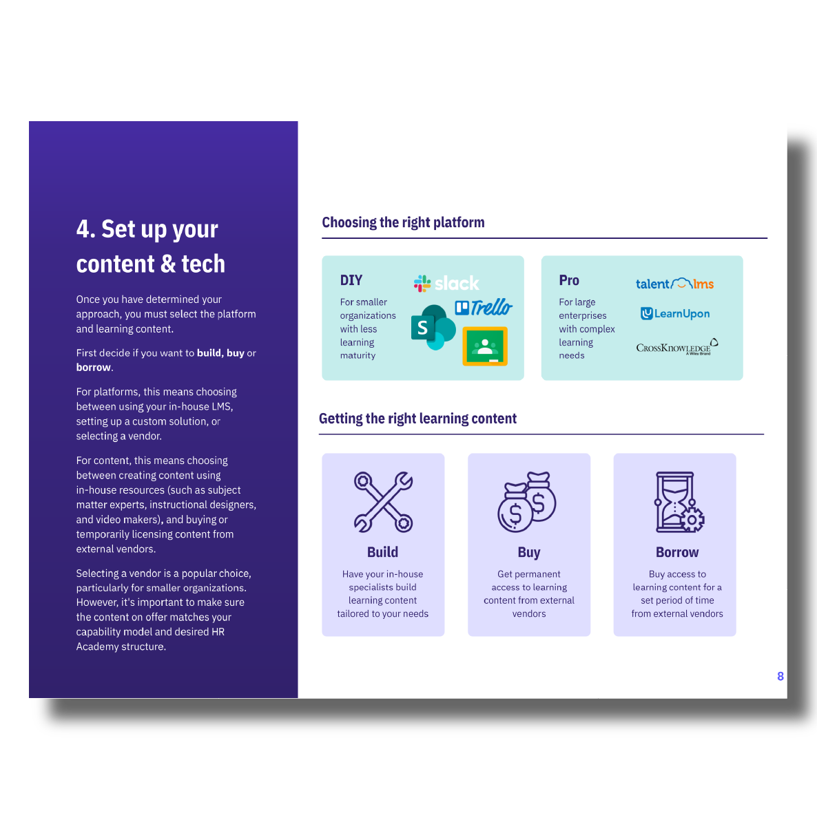This essential guide walks you through the five-step process of setting up an HR Academy of your own. From why you need an HR competency framework to what to consider when selecting the right technology and learning content, this guidebook will help you design and deploy the best solution for your organization.