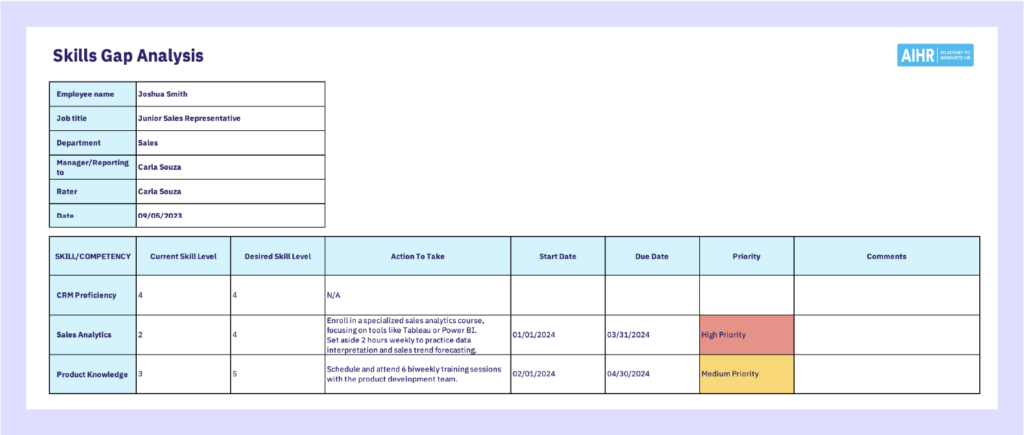 You can create a simple skills gap analysis template on a spreadsheet that compares current skill levels to desired skill levels. It would contain the following fields: