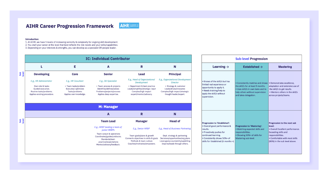 The free career progression framework is based on our own AIHR LEARN career progression framework. Our framework offers AIHR employees two career tracks: The Individual Contributor track and the Manager track.