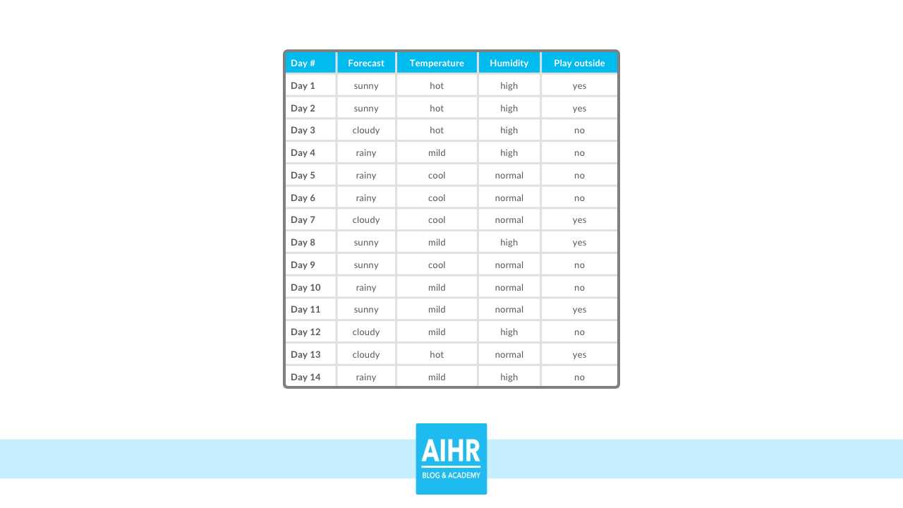 This is a tricky question. Obviously, these weather conditions have something to do with whether kids are playing outside or not. If the weather forecast is rainy, it will probably rain, meaning that kids are less likely to play outside. When it is hot, kids probably will play outside. But does your spreadsheet with information of fourteen consecutive days hold sufficient data to make an accurate prediction on whether or not kids will play outside?