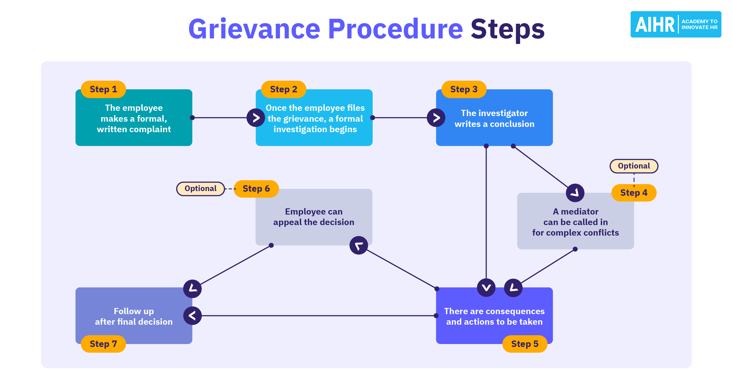 - Investigation process: What process will the company go through to evaluate and respond to the grievance? Who should be involved in that process? Clearly lay it out as part of your grievance policy.
