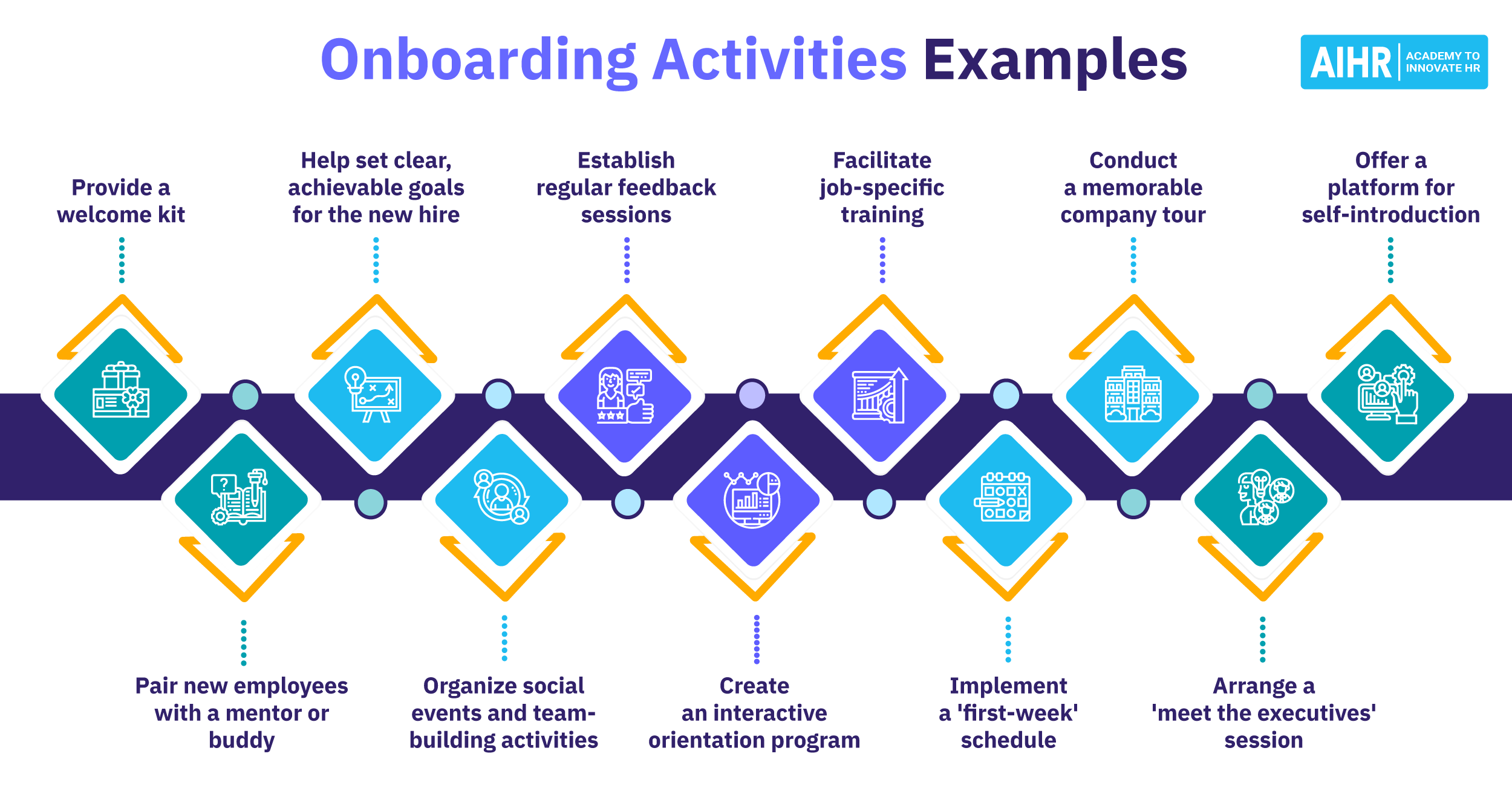 Completing key HR forms, learning about company policies and procedures, meeting team members and other colleagues, IT setup, and basic job training.