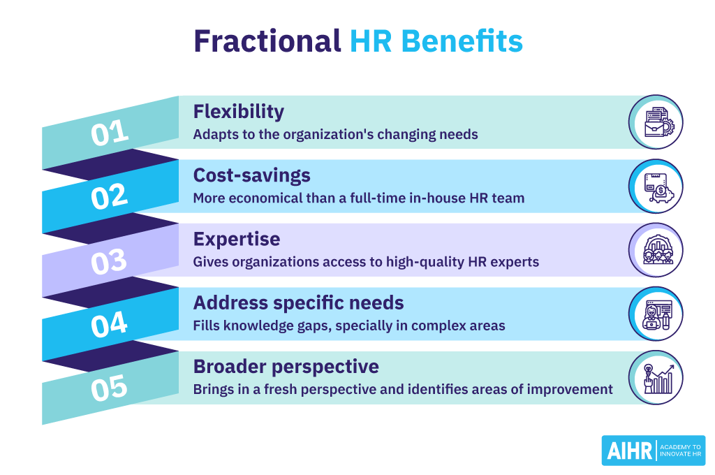Fractional HR might provide your HR team with specific knowledge that they might not have. If your team is simply not able to deal with certain tasks, such as navigating complex compliance issues, fractional HR provides the flexibility to address these needs without having a full-time in-house HR staff.