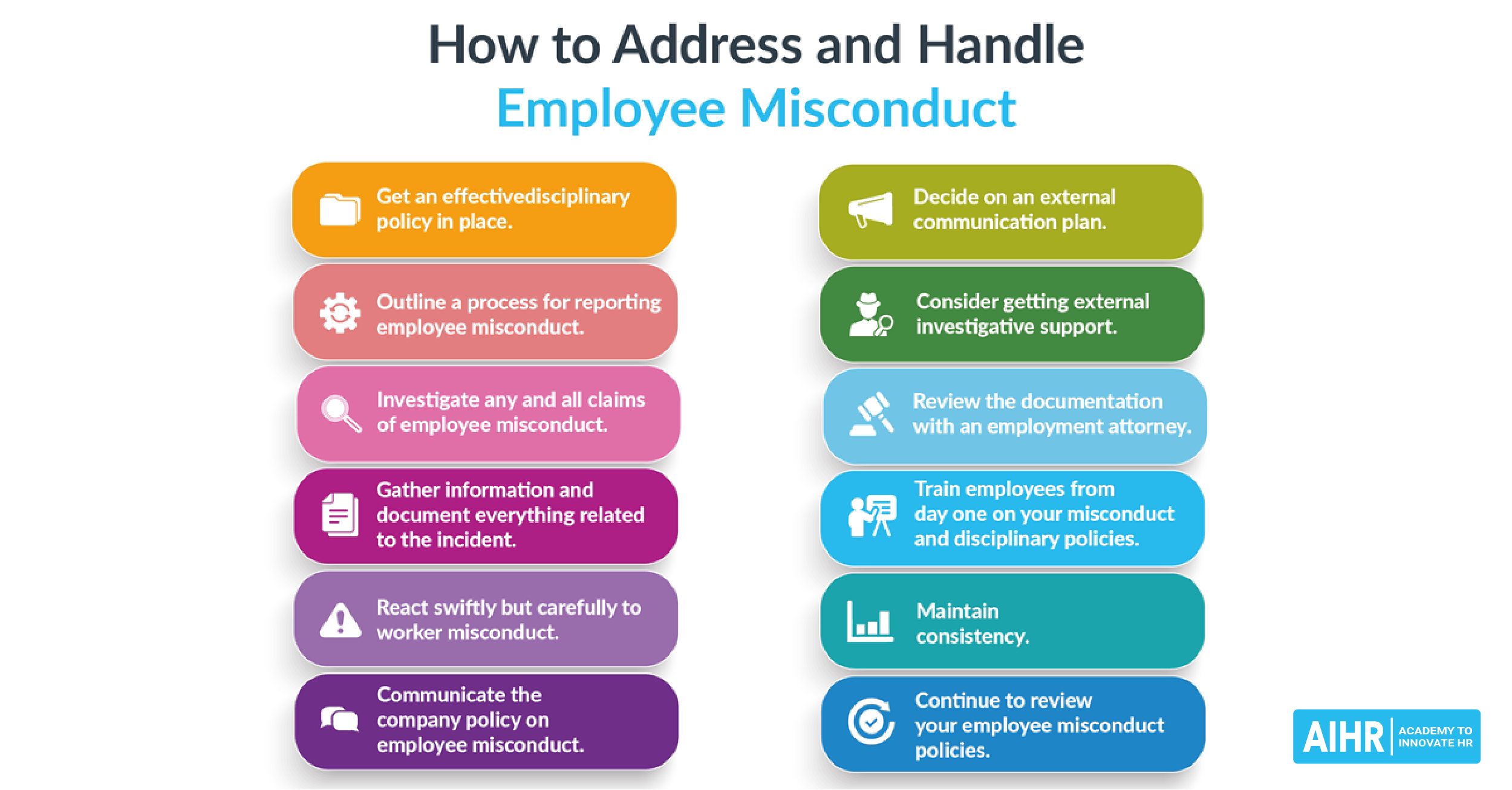 Handling employee misconduct is slightly different from gross offenses. With employee misconduct, you should conduct a thorough investigation of the misconduct and assign disciplinary action depending on the magnitude of the misconduct.