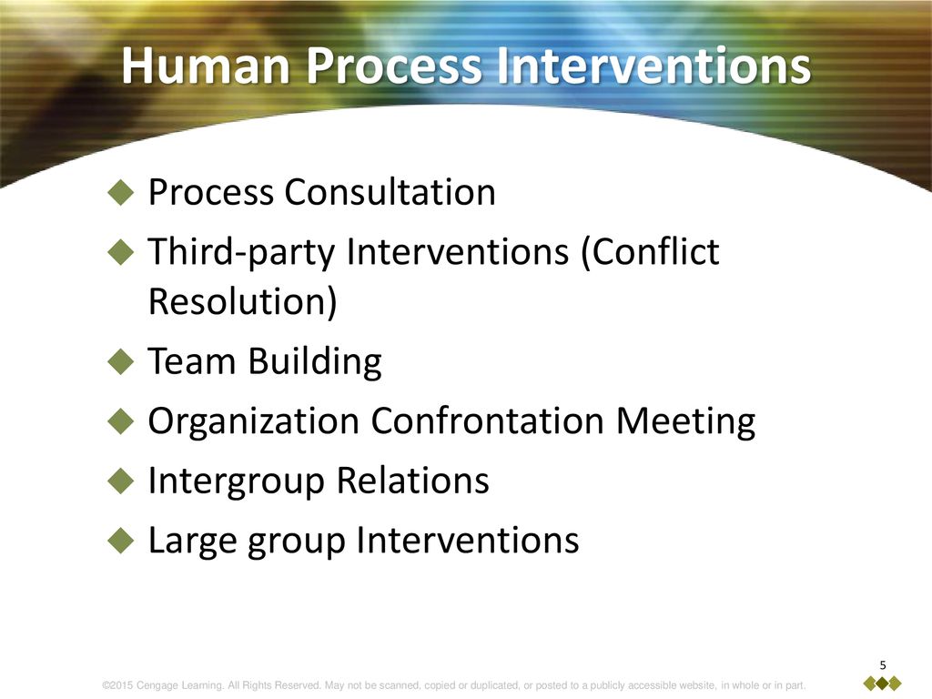 Human process intervention is a deliberate effort to improve the effectiveness of an organization’s human resources function. This type of OD intervention may be aimed at improving the quality of the workforce, improving the management of human resources, or improving the overall effectiveness of the organization.