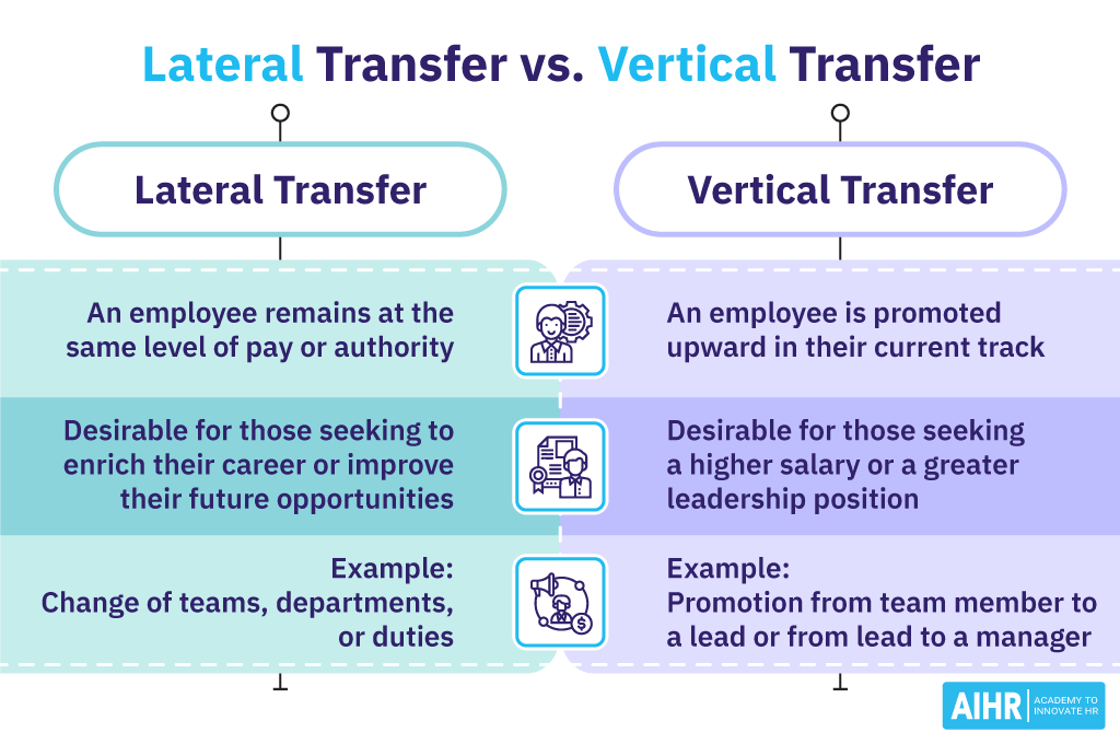 Internal transfers within a company can be either vertical or lateral. A vertical transfer means upward promotion within the same track, while a lateral move involves staying at the same level of pay or authority but changing teams, departments, or roles.