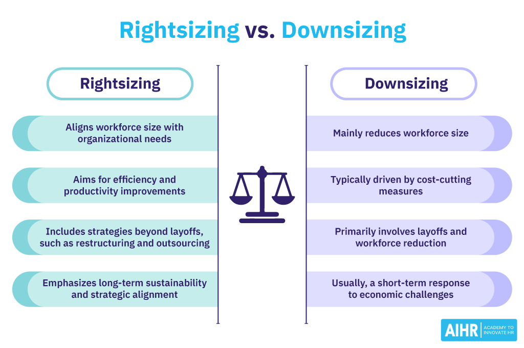 Although the terms “rightsizing” and “downsizing” are often used interchangeably, they have distinct meanings in the field of human resources.