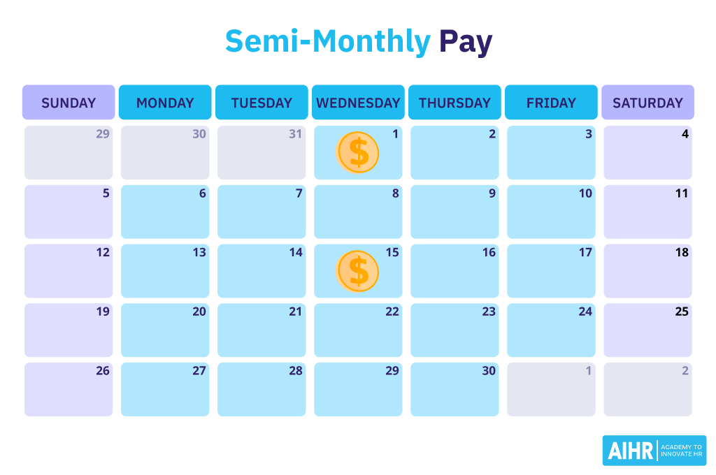 - Pay periods: Every month is divided into two pay periods (e.g., fixed dates like the first and 15th of the month).