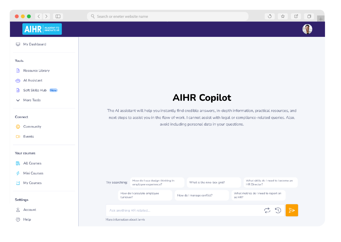Trained on AIHR’s 1000+ articles, 500+ hours of video lessons, and 100+ downloadable resources, the AIHR Copilot puts reliable HR answers at your fingertips. Get quick answers, expert advice, and practical resources to get the job done.