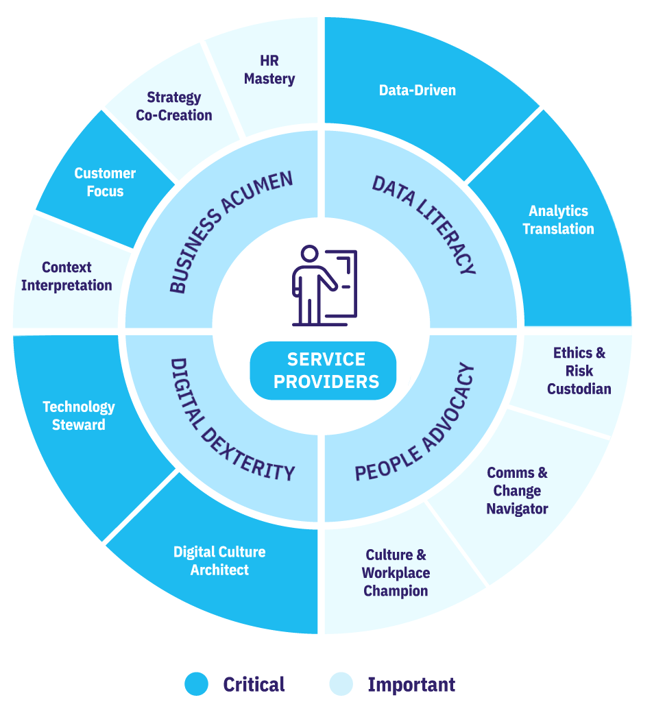 - Skills and behaviors pertaining to the four core competencies listed above (business acumen, digital dexterity, data literacy, and people advocacy)