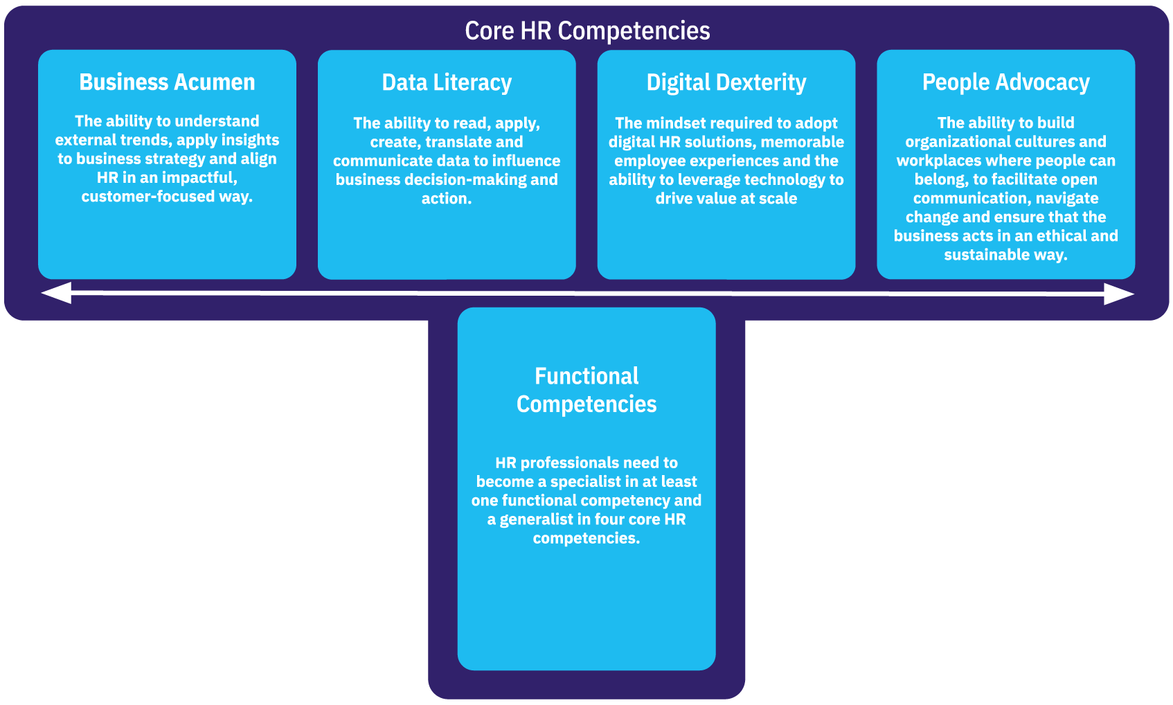 As we look deeper into the competencies you need to perform different roles on the HR spectrum, four stand out as core competencies. We noticed that a typical HR professional will need to develop a set of both functional and general skills throughout their career, which makes them a T-shaped HR professional.