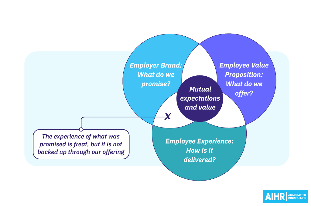 The problem is that the external promise that made candidates decide to join is often never delivered as part of the employee-employer relationship. As a result, employee engagement tends to decline after the “honeymoon period” of talent joining an organization. That places HR in a losing battle to regain employees’ trust. This disconnect between the employer brand and the employee value proposition and experience results in employees feeling betrayed and misled to join the organization.