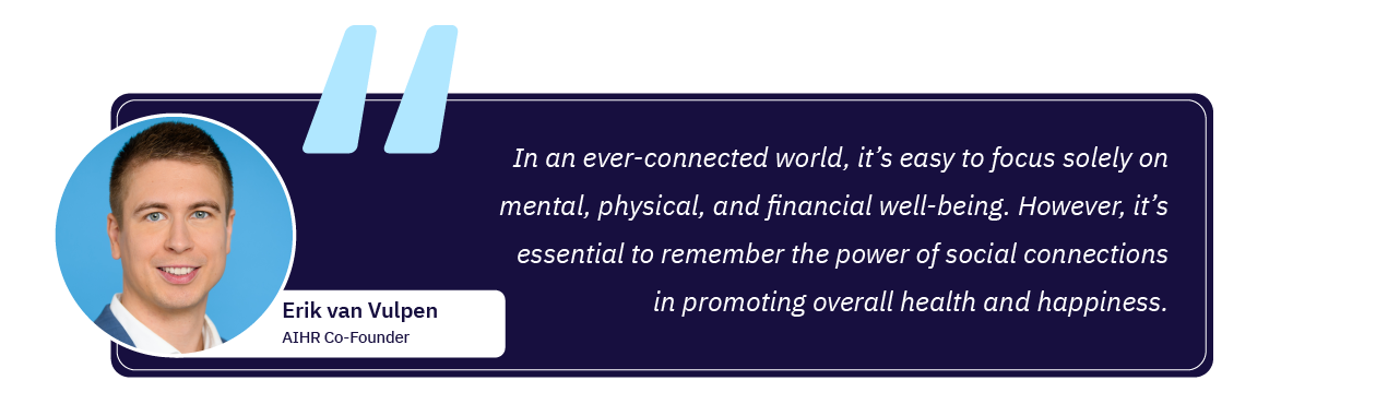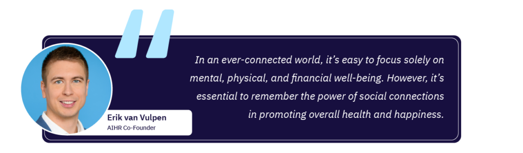 Strong social ties between employees play an important role in their overall total wellbeing and, by extension, are also good for the organization. Here are a few things for HR to consider when it comes to fostering social wellbeing: