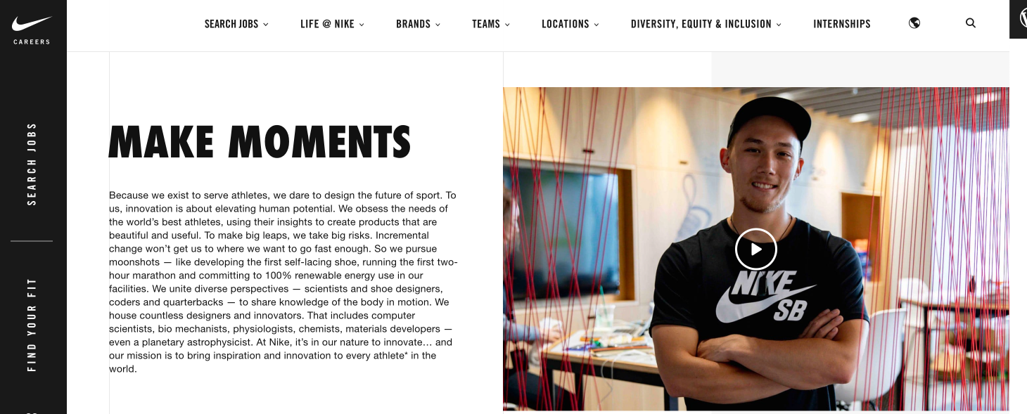 In the video, a selection of employees share how they joined the company and why they felt called to. This is combined with snapshots of life behind the scenes at Nike and inspiring words to draw candidates to their mission. What makes it so effective is that it fits seamlessly with Nike’s values: