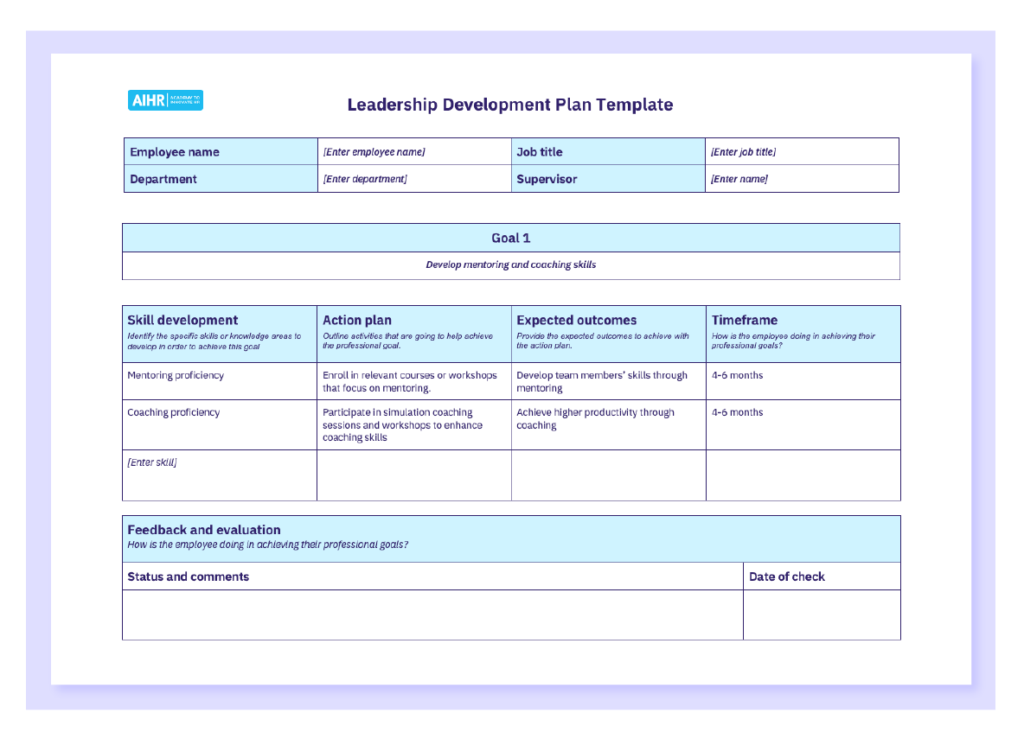 - Leadership development plan template: Create customized learning pathways for high-potential employees.